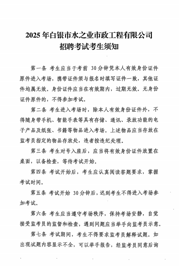 白銀市水之業(yè)市政工程有限公司關(guān)于公開招聘人員考試的通知